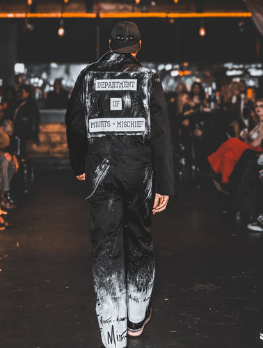 “Misfits and Mischief is a genderless brand that features handmade works of art on streetwear. The leather jacket, pictured, features lyrics written by one of the many local Chicago artists they collaborate with, Valla Di, that they painted by hand to match her writing. All artistic elements of their designs are by hand, down to the spikes and chains.”